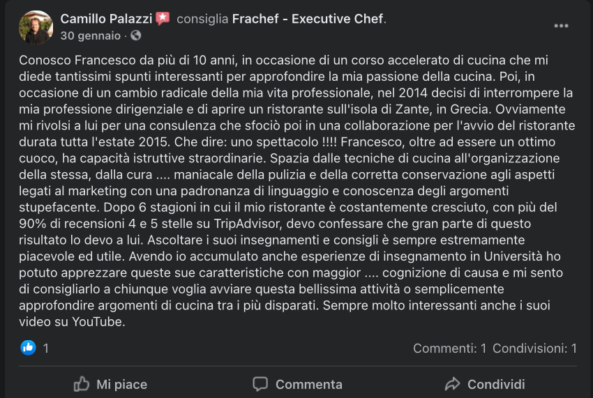 5 anni fa, quando decisi di iscrivermi ad un suo corso, non sapevo niente di ristorazione, vi assicuro che il costo di quel corso è ridicolo rispetto a quello che recupererete nel business con i suoi consigli".